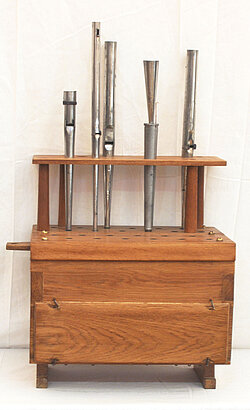1960er Jahre, gefertigt für das Institut für Musikpädagogik der Universität Würzburg von der Orgelbauanstalt G. Weiß, Zellingen am Main. – Höhe: 22 cm, mit Füßen 28 cm, Pfeifenhalter mit Sockeln 13,5 cm, Breite 35,5 cm, Tiefe (ohne Abschluss der Pfeifenstocks): 22,5 cm, unten 19,5 cm. Vorne kann eine Klappe geöffnet werden, dahinter kann man  zwölf Tonventile und die zugehörigen Trakturabgänge sehen. Firmenstempel zweimal in den oberen Ecken der Klappenrückseite. Das Modell wurde 2016 von der Orgelbaufirma Werner Mann gereinigt und mit Pfeifen ausgestattet.