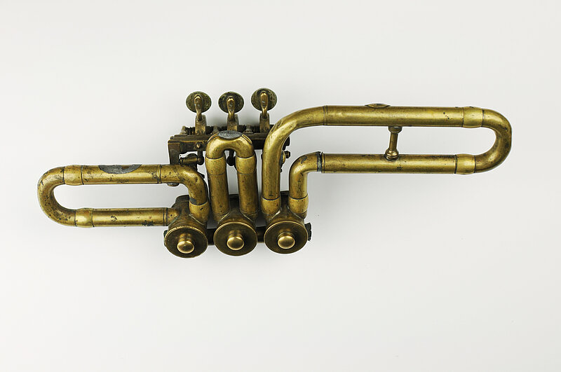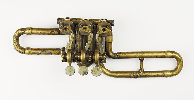 W14a: Ventilmaschine einer Trompete (um 1900) mit Drehventilen. Messing und lackiertes Neusilber. Obere Verbindung des Terzbogens gebrochen. Ventilkappen (dilettantisch) poliert.