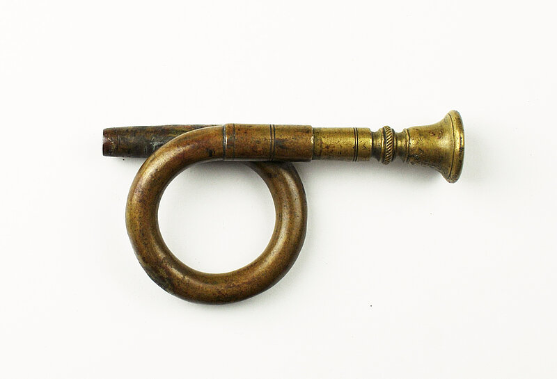 W14b: Mundstück für Parforcehorn mit Halbtonbogen (fest verbunden). Messing, lackiertes Neusilber