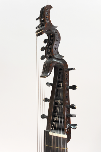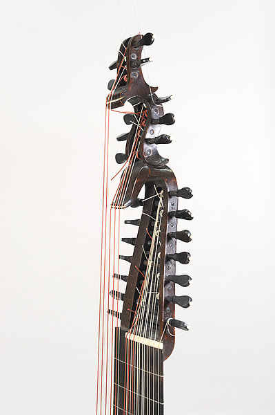 Wirbelkasten (original): 3-facher Wirbelkasten aus Obstholz, dunkel gebeizt und mit dem dunkelbraunen Lack der Muschel lackiert. Ansatz an einer geraden Fuge des Halses (2,5 cm tief), die Stufe zum Wirbelkasten ist abgerundet. Obersättel: Hauptsattel wirkt ergänzt, die beiden oberen Sättel aus Knochen original. Wirbel gehören vermutlich zum alten Bestand des Wirbelkastens.