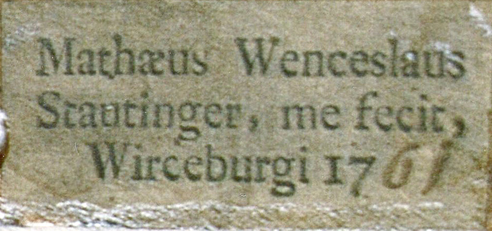Signatur auf Druckzettel im Korpusinneren: ,,Mathaeus Wenceslaus | Stautinger, me fecit, | Wirceburgi 17 [ms.] 73“. Reparaturvermerk: „Repariert Renatus Lechner 1989“