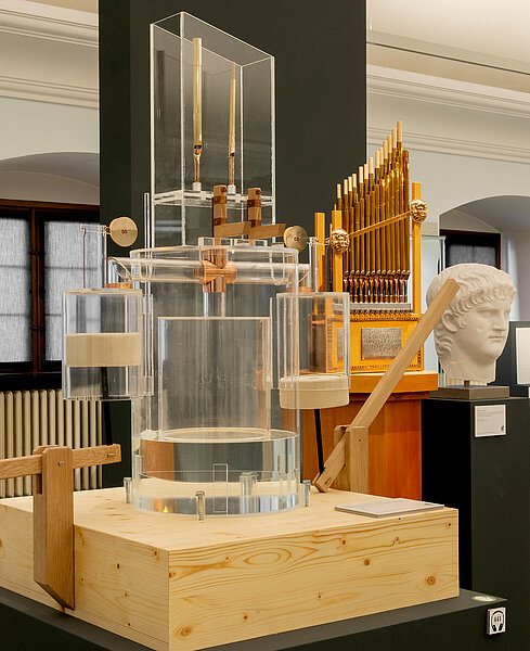 Diesem Ratschlag folgend wurde für die Ausstellung „MUS-IC-ON!“ ein transparentes und spielbares Funktionsmodell angefertigt, an dem die komplizierte Technik jedem Laien verständlich wird. Sind in unserer Vorstellung Orgeln in der Regel fester Bestandteil eines Kirchenraums, so erklangen sie in der Antike zu zahlreichen Anlässen: In der Arena des Amphitheaters, in den privaten Gemächern der römischen Oberschicht bis hin zum kaiserlichen Palast am byzantinischen Hof. Bekannt ist das Faible des musikbegeisterten Kaisers Nero für den Klang und den Mechanismus der Orgeln: