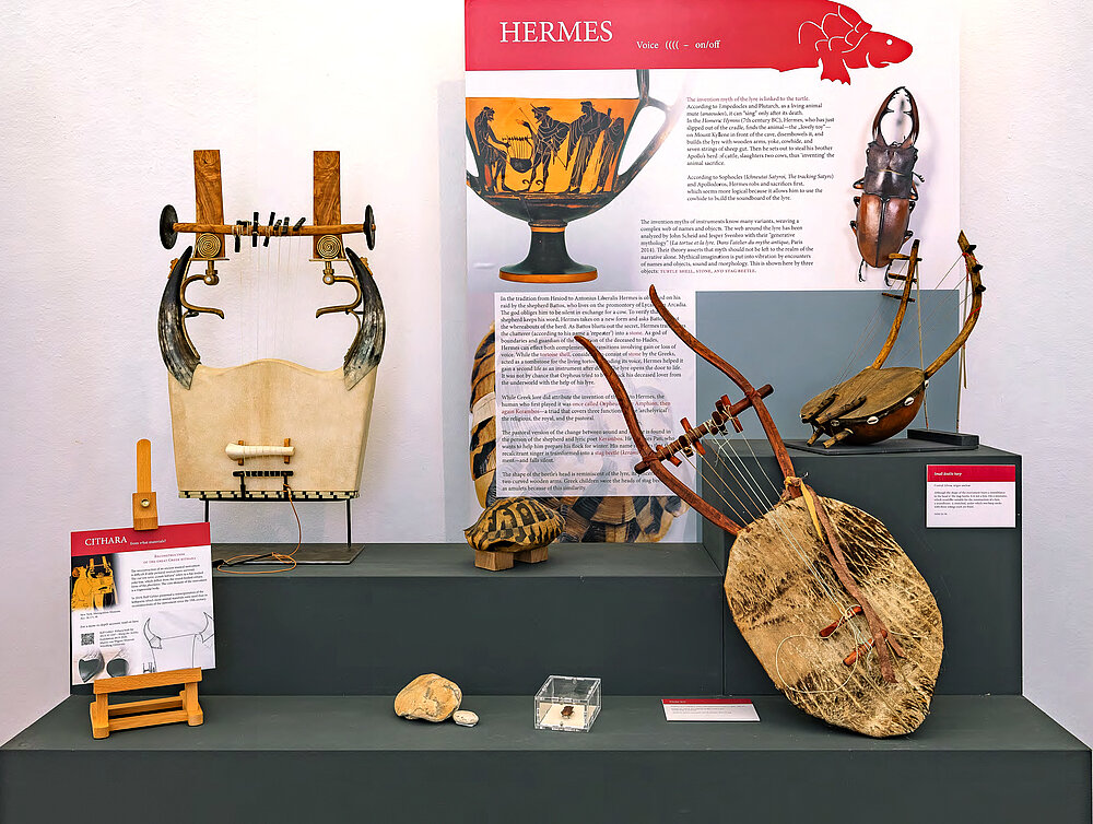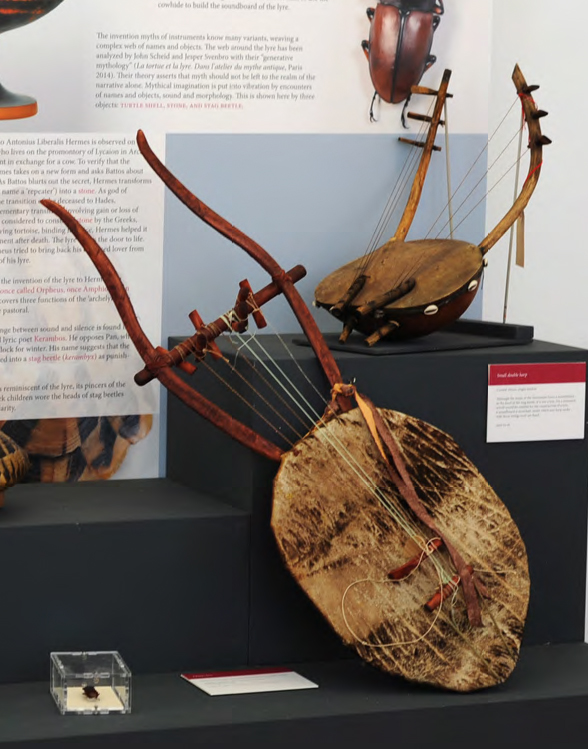 Invention myths of instruments know many variants, weaving a complex web of names and objects. The web around the lyre has been analyzed by John Scheid and Jesper Svenbro with a “generative mythology” (La tortue et la lyre. Dans l’ atelier du mythe antique, Paris2014). Their theory asserts that myth should not be left to the realm of the narrative alone. Mythical imagination is put into vibration by encounters of names and objects, sound and morphology. This is shown here by three objects: turtle shell, stone, and stag beetle.