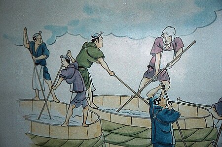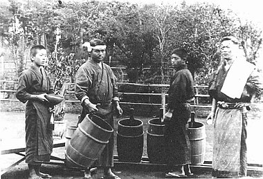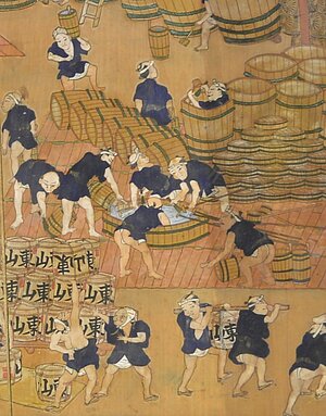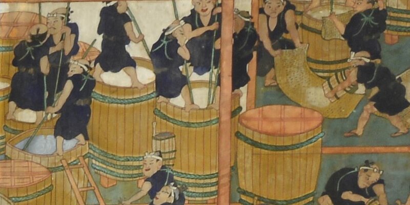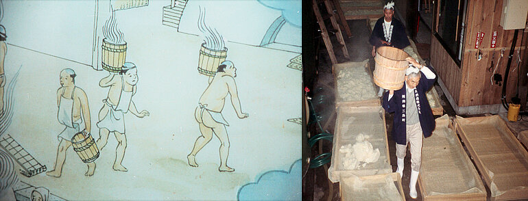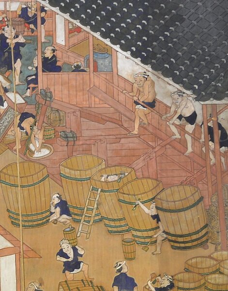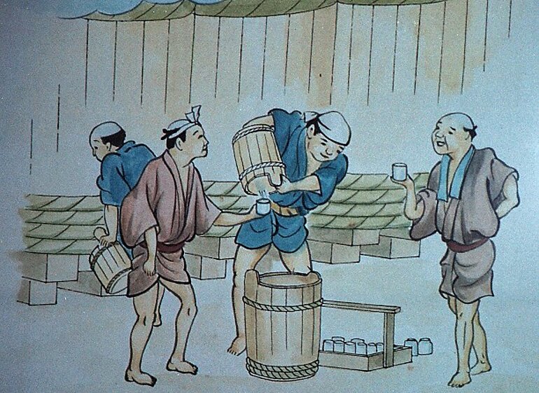 1. Aus den Zutaten, die wir jetzt rühren, wird später Sake, und dieser wird nach Edo gebracht.