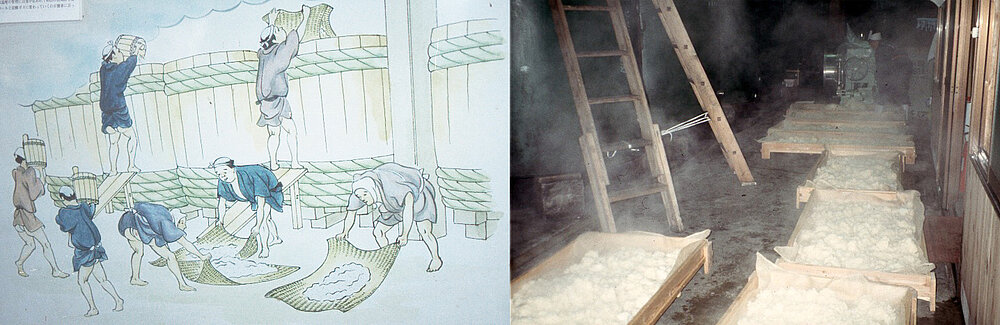 koji-zukuri – Herstellung der Reis-Hefe: Der gedämpfte Reis wird danach bis zur gewünschten Temperatur abgekühlt. Ein Teil des gut temperierten Reises wird mit Hefepilzen injiziert. Anschließend wird unter kontrollierter Temperatur und Feuchtigkeit die Reis-Hefe angesetzt. Die Qualität der Reis-Hefe bestimmt den Duft des Reisweins.