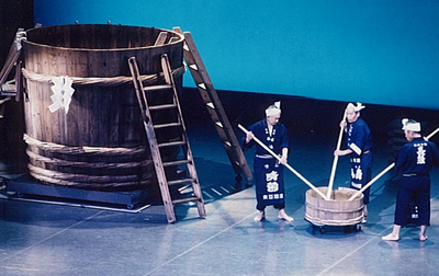 1. Das Fass klingt von sich allein? Oder es klingt es, weil man mit sasara (einem Werkzeug, mit dem man die Fässer putzt) das Fass scheuert? - Es klingt so schön, weil die Maserung des Fasses und das sasara-Werkzeug sich einander beißen.