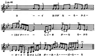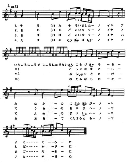 [10.] San-koro (4:31) und niban-gai-dochu-uta (1:13) Gesang zur dritten Phase der Fermentation.