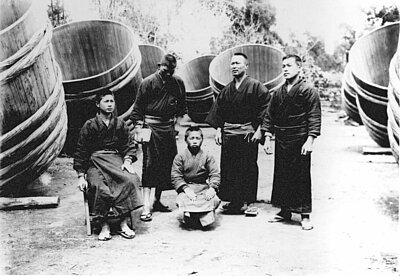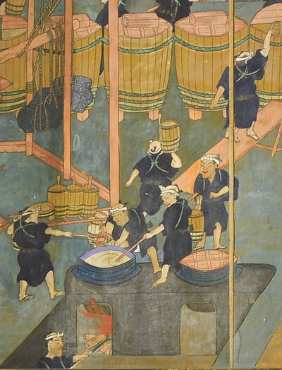Abb. 5: Der Reis wird in dem großen oke-Fass gekocht. Aus einer kolorierten Zeichnungsserie der Tsuchida Honten Brauerei in der Präfektur Gumma (Japan).