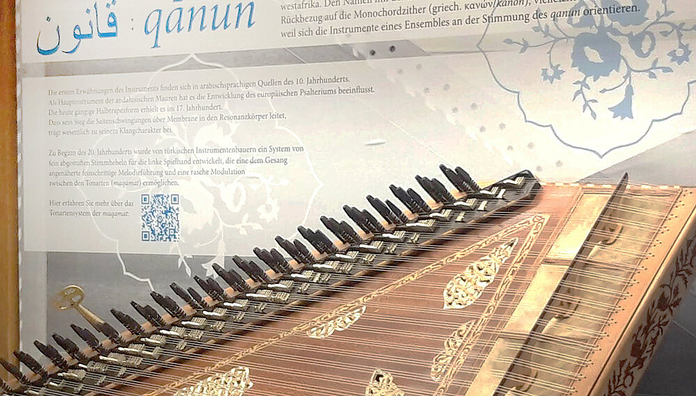 Wintersemester 2024/25. Qanun: Der arabische Name bedeutet (wie das griechische kanón) Gesetz, Maßstab. Das Wort al-qānūn für eine Kastenzither ist seit dem 10. Jahrhundert nachweisbar, so auch erste Abbildungen. Betrachten Sie das Instrument des Istanbuler Qanun-Bauers Turhan Tezelli und hören Sie Aufnahmen verschiedener maqamat. – Das Instrument war Teil der Ausstellung "Syrische Tonspuren in Würzburg" (Nachdokumentation hier).