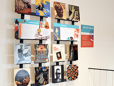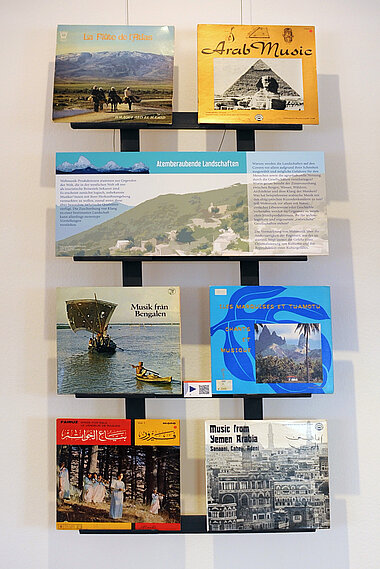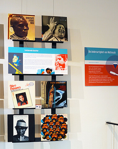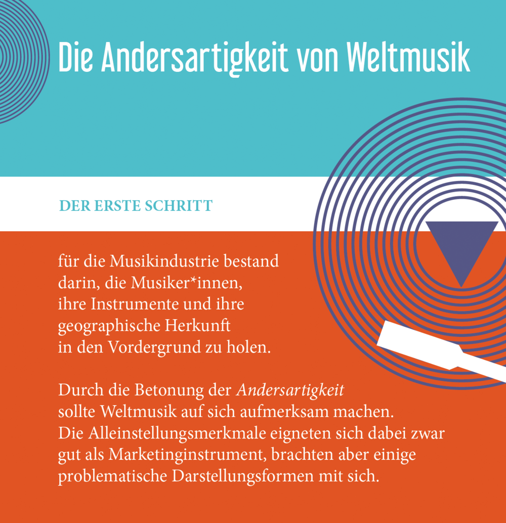 Werden die Instrumente nur folkloristischen Stilen zugeordnet oder existieren in anderen Kulturen auch repräsentative Musikstile, die mit weltlichen oder religiösen Autoritäten in Verbindung stehen? Sind Weltmusik-Instrumente ebenso kostbare Gegenstände wie westliche Orchesterinstrumente? Treten alle Musiker*innen ohne technische Verstärkung auf? Warum nimmt der Boden, die Erde oder die Landkarte eine so zentrale Stellung auf den Plattencovern ein? Finden Musikaufführungen immer nur unter freiem Himmel statt? Warum wird ausgerechnet ein Musiker anders inszeniert?