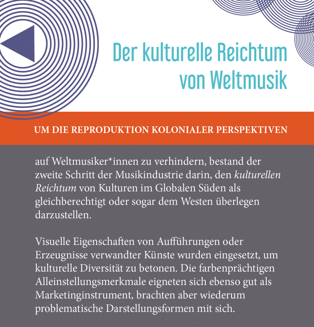 Die Vermarktung von Weltmusik über Formen von Bildender Kunst birgt die Gefahr, auf eine Symbolebene auszuweichen, die es dem Publikum überlässt, einen beliebigen semantischen Bezug zwischen Bild und Klang zu knüpfen.