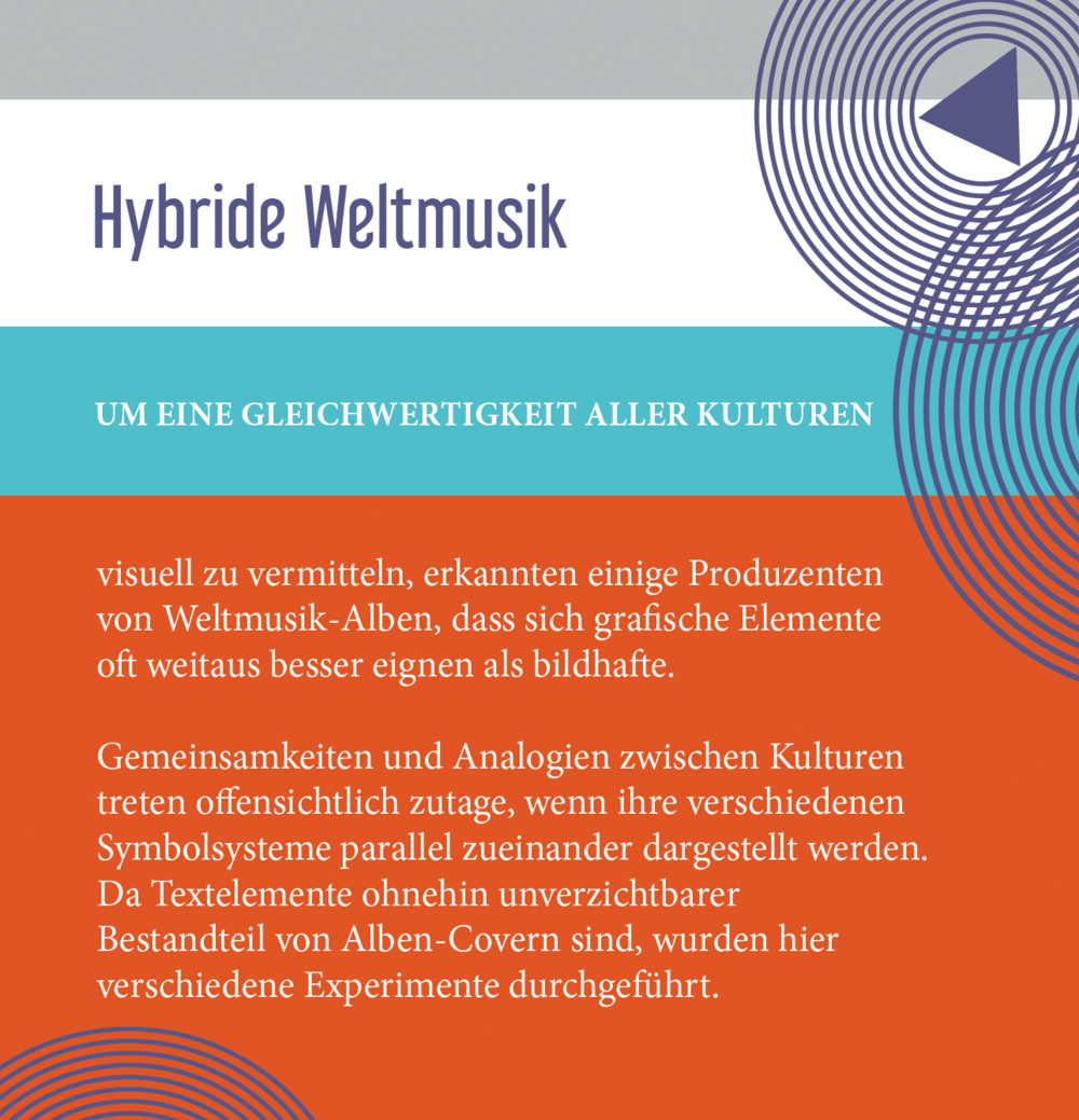 Es sind die pädagogischen Produktionen, die ernsthaft versuchen, kulturvermittelnd zu wirken oder die Thematik der Migration anzusprechen. Dort finden sich dann Informationen und Liedübersetzungen eher auf den Rück- oder den Innenseiten der Alben. Die Möglichkeiten, die Anliegen der Weltmusik-Bewegung über Plattencover zu vermarkten, haben somit ihre Grenzen. Die Aufgabe der musikwissenschaftlichen Forschung und Lehre besteht darin, diese Lücken auszugleichen.