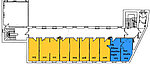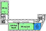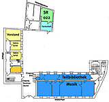 Legende zu den Raumplänen: sattblau = Bibliothek, Archive, Tonstudio; gelb = Vorstand und Verwaltung; grün = Lehrräume; orange = Büros des wiss. Personals; hellblau = Fachschaft