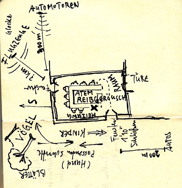 1. Sitzung (Wo-Hören): Raumhören (5 Minuten: Residenzplatz 2A; HS III, geöffnetes Fenster, geschlossenes Fenster). Bemerken der Aufmerksamkeiten. Der Entfernungen. Gespräch über die mögliche Konzeption des Seminars. Maps in mehrerlei Hinsicht: Hören von Raum. Referat von Texten: Zum Hören; zum Hörer; zum Ohrwurm; zu andern Ohr-Tieren. Fernsinn: Wie fern sind Motoren (Flugzeuge)? - Sphären.