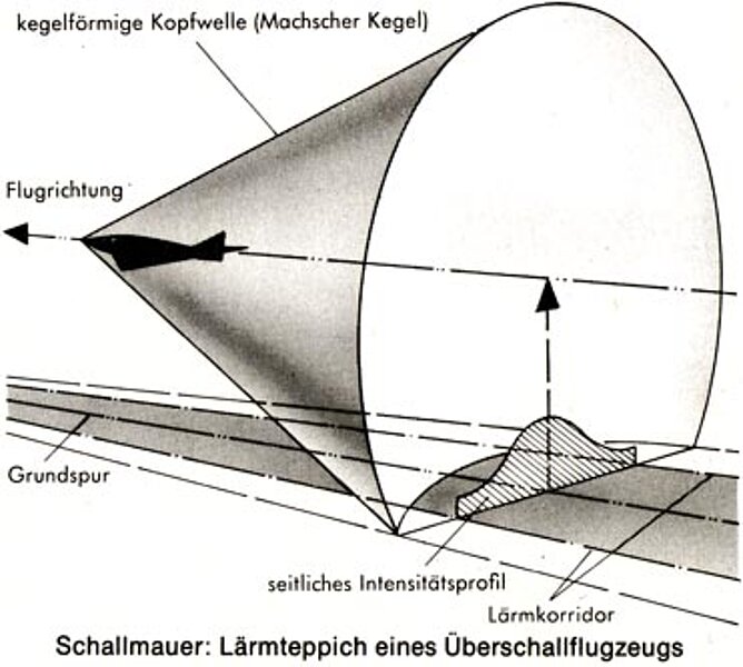 Das "Durchbrechen der Schallmauer" ist eine Metapher für eine starke Zunahme des Luftwiderstands von Flugkörpern, die bei Annäherung an die Schallgeschwindigkeit auftritt. Durch die Verdrängungswirkung des mit Schall- oder Überschallgeschwindigkeit bewegten Körpers werden auf einem mit dem Körper mitbewegten Kegelmantel (Machscher Kegel) Verdichtungsstöße verursacht, die am Boden als Knall wahrgenommen werden, in einem Gebiet (dem sog. Lärmteppich), das durch die Schnittlinie des Machschen Kegels mit der Erdoberfläche begrenzt wird. Diese Druckwelle kann Fensterscheiben zum Bersten bringen. (Vgl. dtv-Brockhaus-Lexikon, Wiesbaden und München 1982, Bd. 16, S. 86, von dort die Abbildung unten.)