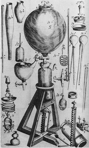 Robert Boyle erfand mit Unterstützung von Robert Hooke 1658/59 die Vakuumpumpe, ein spektakuläres Instrument der experimentellen Naturwissenschaft des 17. Jahrhunderts. Der luftleere Behälter stellte einen völlig neuartigen Versuchsraum dar. "Boyle benutzte den Apparat, um die Elastizität von Luft bzw. die 'Luftfederung' zu untersuchen, und fand so auf empirische Weise schließlich das ihm und Edme Mariotte zugschriebene Gesetz über die Relation von Druck und Volumen bei eingeschlossenen Gasen. Lehrbücher lassen seine Entdeckungen oft täuschend einfach erscheinen und stellen sie als direktes Ergebnis seines Versuchsapparates dar. [...] Forschungen haben jedoch gezeigt, wie komplex die gesellschaftlichen und sozialen Voraussetzungen waren, die bei der Entdeckung neuer Fakten der Natur mittels Apparaten und Experimenten eine Rolle spielten. So gab es [...] ein Jahrzehnt nach Boyles Erfindung höchstens eine Handvoll der kostspieligen Pumpen an unterschiedlichen Orten. Alle waren undicht und ließen sich nur schwer in funktionsfähigem Zustand halten. Unter solchen Umständen Experimente nachzuvollziehen und Versuchseffete zu wiederholen, erwies sich als illusorisch." (Zit. aus: James E. McClellan und Harold Dorn, Werkzeuge und Wissen. Naturwissenschaft und Technik in der Weltgeschichte, Deutsch von Michael Hein und Bernd Rullkötter, Frankfurt am Main 2001, S. 323.)