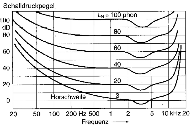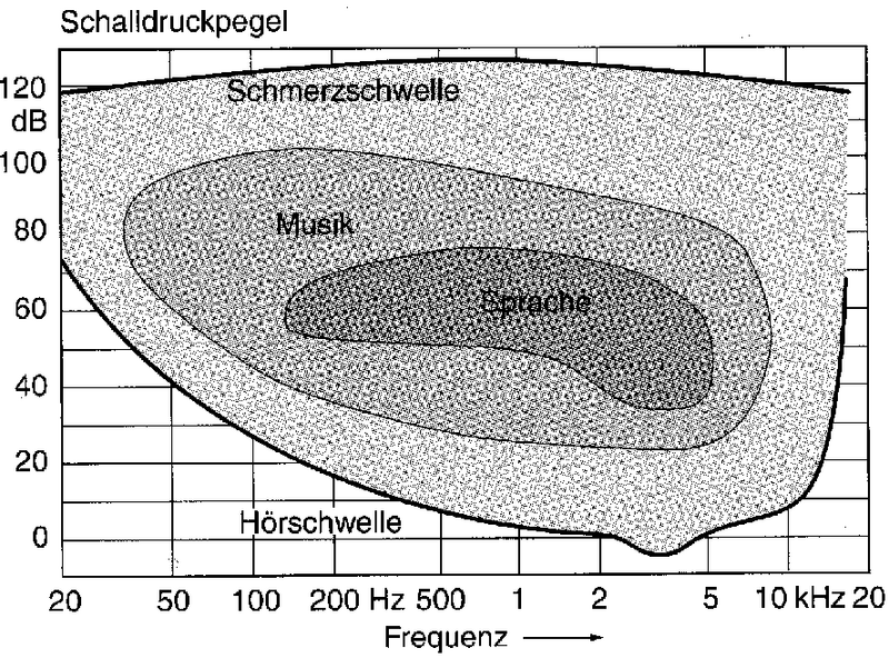 Im menschlichen Gehör wird Schallempfindung (Gehöreindruck) zwischen 16 Hz und 20 kHz hervorgerufen. Frequenzen unter 16 Hz werden als Infraschall, über 20 kHz als Ultraschall, über 109 Hz als Hyperschall bezeichnet. Die Unterschiede des Schallspektrums lassen Differenzierungen der Schallempfindungen zu in Knalle, Geräusche, Klänge oder Töne.